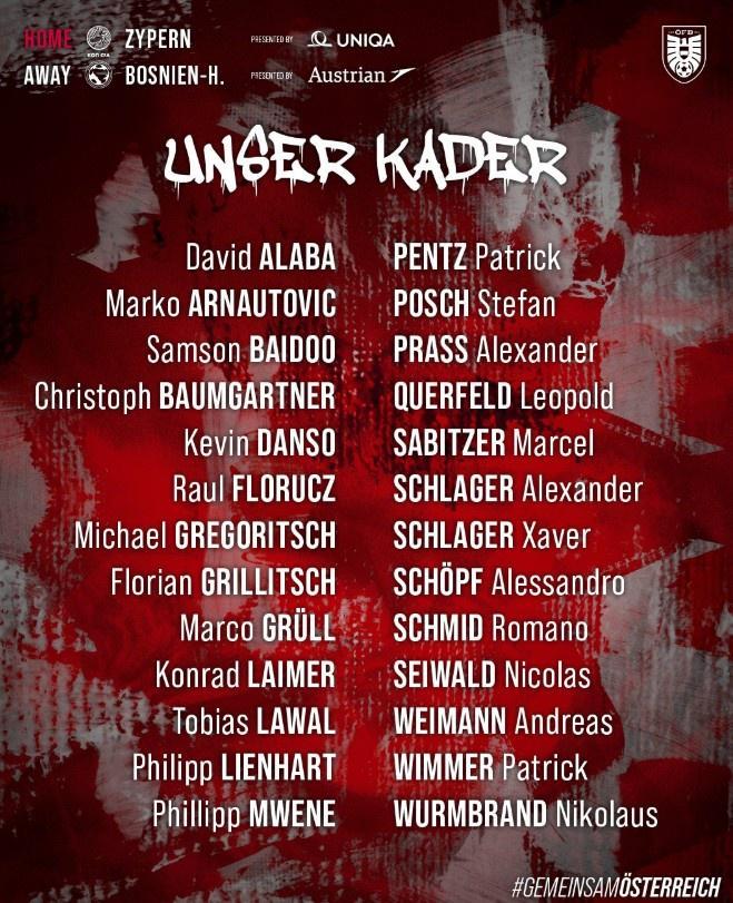 奥地利大名单:阿拉巴领衔,萨比策、莱默尔、阿瑙、丹索入选